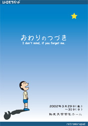 レトロモラパッドという名前になっての初公演。かかる曲全てがバンド『音楽室』の楽曲で、これが世に言うコラボレーションと言うやつですな。音楽室の曲達をアレンジャー/コンポーザ-で活躍中の岩崎健一郎氏に編曲していただき、岩崎氏・中村一臣氏が演奏して録音してくれると言う夢のような公演でした。音楽室も『おわりのつづき』というテーマ曲も作ってくれて、なんだかもう脳しんとう起こしそうでした。最近では音楽室は単独ライブを開くようになり、サイコ-の音楽を休む事なく作り続けています。